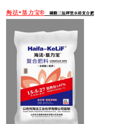 海法墾力寶大量元素 本品全溶于水、能快速補充作物所需的氮磷鉀及中微量元素。特別添加海藻酸等助劑,適合各種蔬菜或灌根結合葉面噴施,促進果實膨大,效果尤為突出,快速解決作物缺素癥狀,顯著提高缺素地區作物產量和品質,產品速溶性好,溶解后無任何殘渣,更易被作物直接吸收,以色列海法墾利寶進口水溶肥,粉劑,氮磷鉀含量有平衡,高鉀,適用于各種農作物,大棚經作,露天蔬菜,全水溶無殘渣,改良土壤,抗病抗逆,提高作物品質。