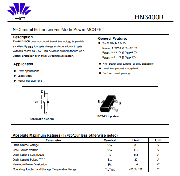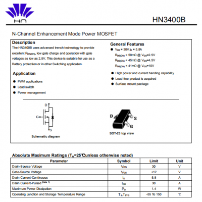 HN3415參數:-20V -4A SOT-23 P溝道 MOS管/場效應管