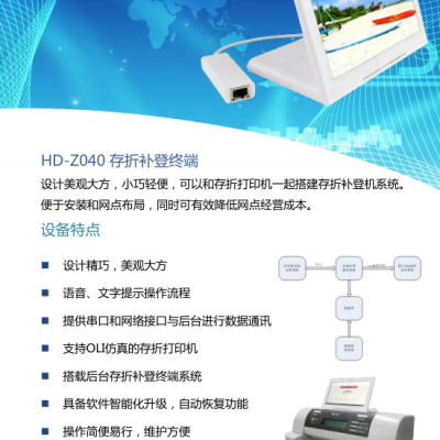 設(shè)計(jì)美觀大方,小巧輕便,可以和存折打印機(jī)一起搭建存折補(bǔ)登機(jī)系統(tǒng)。 便于安裝和網(wǎng)點(diǎn)布局,同時(shí)可有效降低網(wǎng)點(diǎn)經(jīng)營成本。