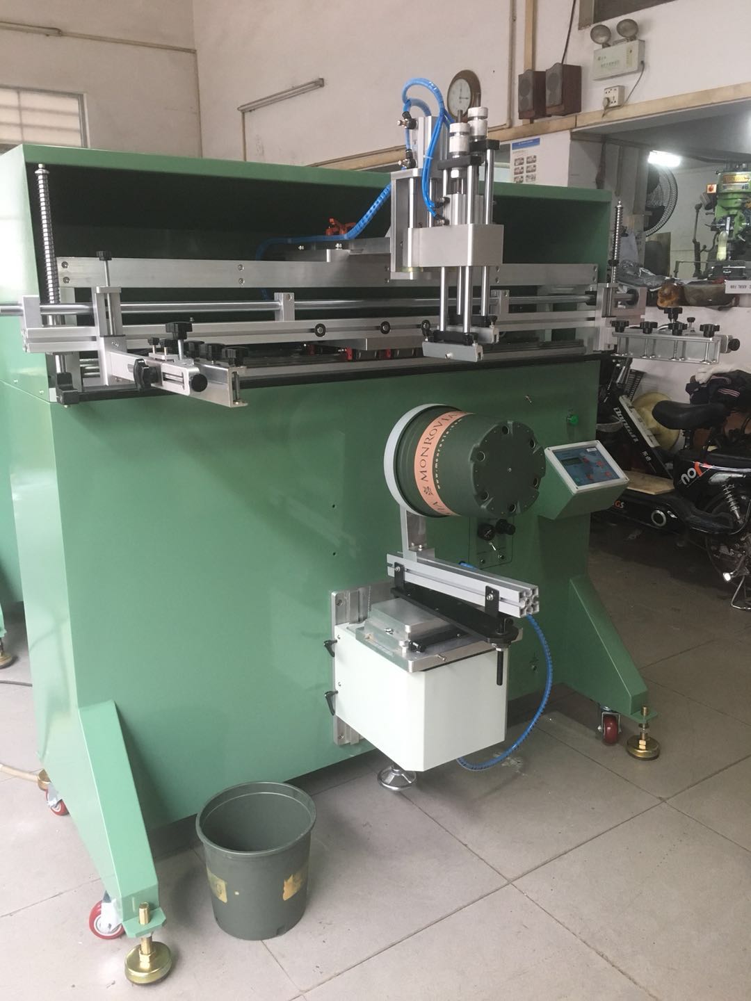 佛山市花盆絲印機加侖花盆滾印機塑料花盆絲網(wǎng)印刷機印刷速度快,精度高,色彩鮮艷,墨層厚,立體感強,絲印效果顯著,節(jié)省人工,提高產(chǎn)能全自動曲面旋轉(zhuǎn)印刷機塑膠、玻璃、陶瓷、木材、金屬等材質(zhì)制成之的圓筒、橢圓、扁型產(chǎn)品的曲面絲網(wǎng)印刷。印刷產(chǎn)品例如:唇膏外殼、化妝品瓶子、洗滌劑瓶子、飲料瓶、杯子,濾清器、罐子、玩具等。。。。。大型轉(zhuǎn)盤絲印機全自動機械手上下料絲網(wǎng)印刷機,廣泛適用于:電子電器,廣告,包裝印刷,運動器材,玩具,文具禮品等行業(yè)。產(chǎn)品例如PCB、LCD、EL、IC、SMT等。同時該機型也適宜其他精密印刷,貼紙、陶瓷花紙、薄膜開關(guān)(按鍵)、海報、汽車玻璃、儀表、建筑飾板、銘板、廣告牌標牌等。176余2012先2274生