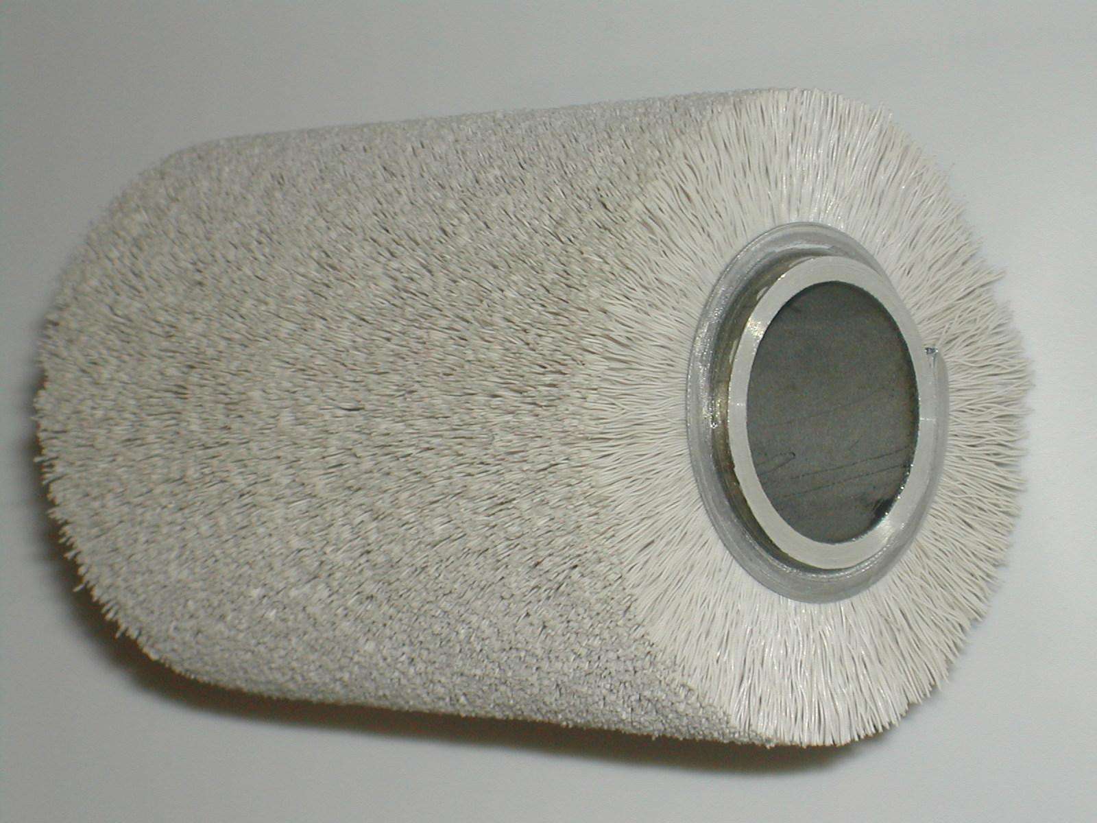 2、磨料絲毛刷輥:磨料絲中添加金鋼砂等特殊材料,其耐磨度上更勝尼龍絲一籌。因為其具有耐酸,耐堿等特性,主要應(yīng)用在鋼鐵業(yè)或其它五金行業(yè),用來對鋼板的清潔去銹去氧化皮,鋼材的初加工,鍍鋅鋼板的生產(chǎn),鋼板彩涂;其它鑄造件的去毛刺打光處理,鋼帶、鋁帶、銅帶等產(chǎn)品的拋光處理和鏡面效果處理等行業(yè)。含磨料尼龍刷絲是以尼龍612為基材,結(jié)合加入20-40%碳化硅或氧化鋁拉絲加工成形的特殊刷毛。具有很高的強(qiáng)度/剛性/耐疲勞性/耐化學(xué)性/融點(diǎn)高等優(yōu)點(diǎn)。