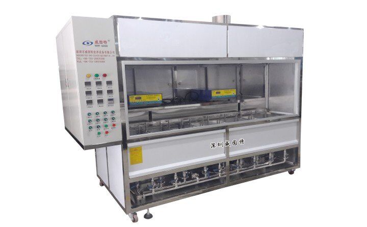 自動上料—洗劑超聲清洗—純水超聲清洗—純水超聲波漂洗—純水超聲清洗—純水超聲清洗—純水超聲波清洗—自動下料。