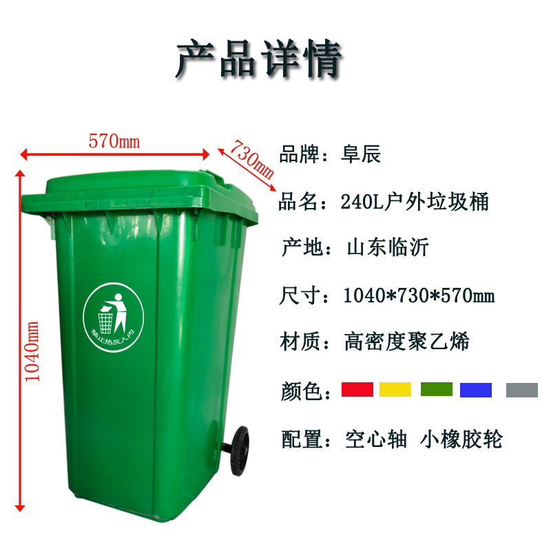 本網頁所展示的有關 山東阜辰塑業有限公司 為你提供的“廠家直銷 240L塑料垃圾桶 環衛垃圾桶 分類垃圾桶”環衛垃圾桶價格、型號、圖片、廠家等信息。如有需要請撥打電話:0539-3129278。
