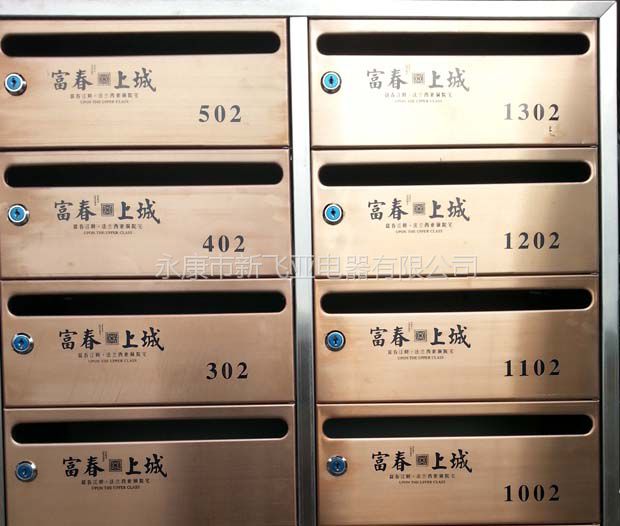本網頁所展示的有關 永康市新飛亞電器有限公司 為你提供的“富春江上一座城富江上上城不銹鋼信報箱”信報箱價格、型號、圖片、廠家等信息。如有需要請撥打電話:0579-87186728。