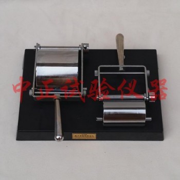 該儀器主要由壓架與脫模兩個部分組成,使用時首先將壓緊輥柄和壓架放置托模的后端,使托膜wan全顯露出來,然后將樣板插入托膜后端的小槽內(nèi)并用壓緊柄使偏心軸壓住樣板的一端,然后將壓架搬下通過壓架上的滾動軸使樣板沿著托膜表面均勻地彎曲變形,壓架搬至定位肖處為上z后觀察樣板膩?zhàn)幽け砻娴奈锢碜兓?/span>