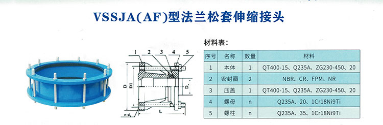 法蘭松套伸縮接頭由本體、壓蓋、密封圈和緊固件組成 ,其中本體一個,壓蓋一個,密封圈兩個,螺柱螺母各若干。承插口同樣適合與鋼管、鑄鐵管、球墨鑄鐵管、PAC管、ABS管等連接。