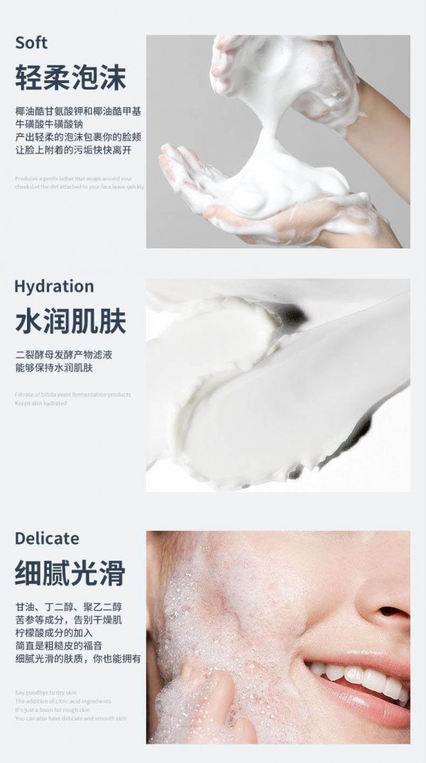 特點(diǎn):1.輕柔泡沫,椰油酷甘氨酸鉀和椰油酷甲基牛磺酸牛磺酸鈉產(chǎn)出的泡沫包裹你的臉頰,讓臉上附著的污垢快快離開(kāi);2.水潤(rùn)肌膚,二裂酵母發(fā)酵產(chǎn)物濾液能夠保持水潤(rùn)肌膚;3.細(xì)膩光滑,甘油,丁二醇,聚乙二醇,苦參等成分,告別干燥肌,檸檬酸成分的加入,簡(jiǎn)直是粗糙皮的福音,細(xì)膩光滑的膚質(zhì)你值得擁