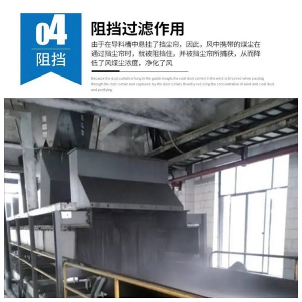 導料槽防塵簾主要用于阻擋過濾風流中的煤塵,通過物理攔截和噴霧濕潤雙重作用降低粉塵濃度。
