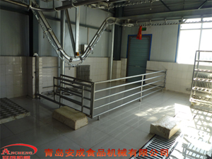 該設備用于中等體型豬屠體的脫毛工序。經毛豬自動浸燙機浸燙的豬體隨輸送鏈行進至隧道式刨毛機上方時,被卸下并落入刨毛機內接受刨毛,并在結束后滑落至清水池中或平板式輸送機或者脫毛豬接收平臺上。須與毛豬自動浸燙機配合使用,適用于大中型屠宰加工廠豬胴體通過隧道時,各處的毛均被刨除,避免了豬進出刨毛機困難、夾豬或飛豬現象,不易損傷豬皮,豬毛能夠定向排出,改善了生產條件。
